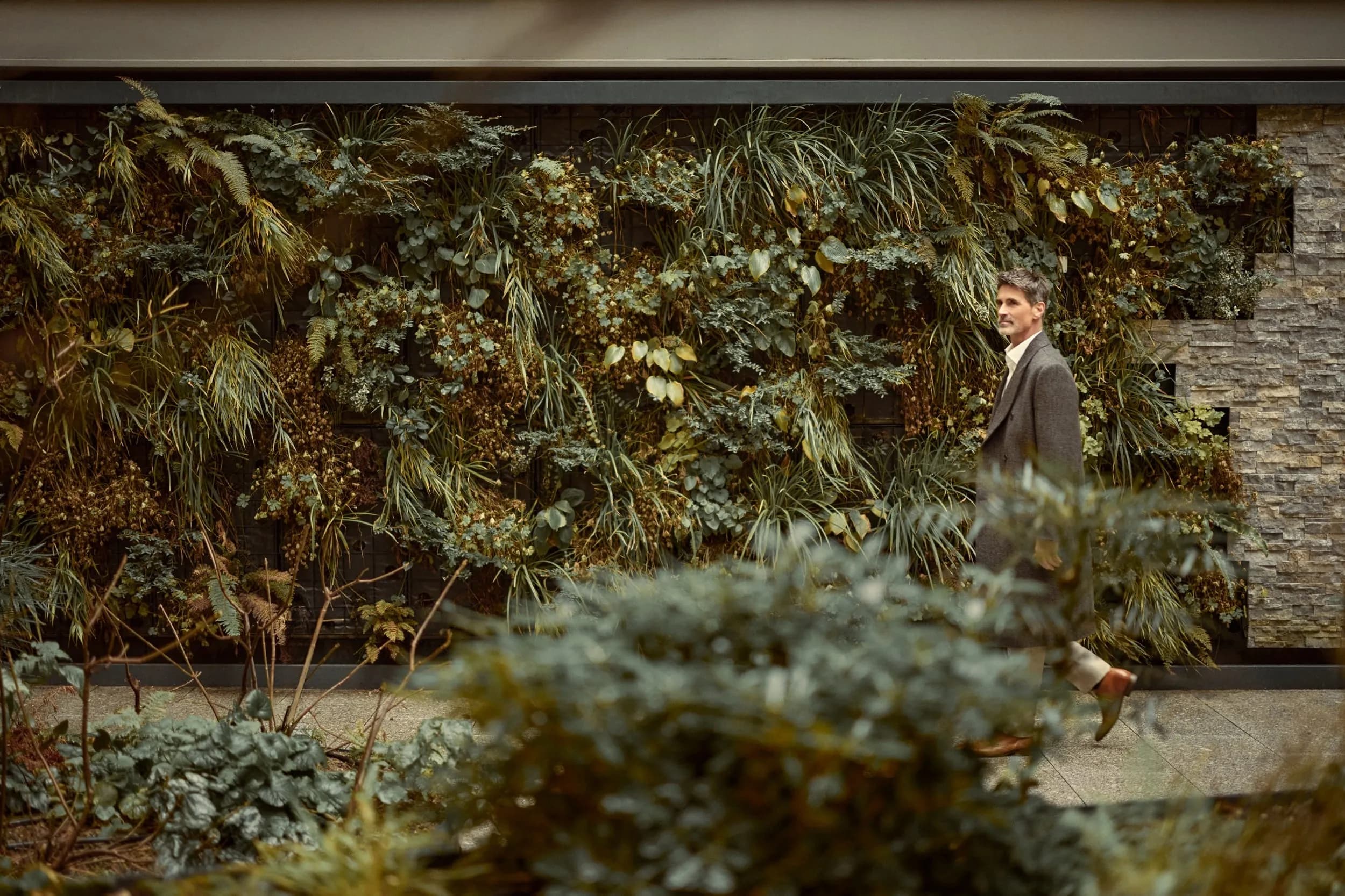 The experience of living here is one of constant, subtle change. The terraces are designed as rich, green spaces with a layered structure that offers year-round surprises. In winter, when the leaves have fallen, the red stems of Cornus sanguinea emerge as vivid accents; in other seasons, a mix of flowering plants forms a living bouquet, from bold, sculptural blooms to fine, biodiverse groundcovers. Between them, ornamental grasses — including striking black grass, chosen for its evergreen, almost surreal foliage — add texture and contrast.