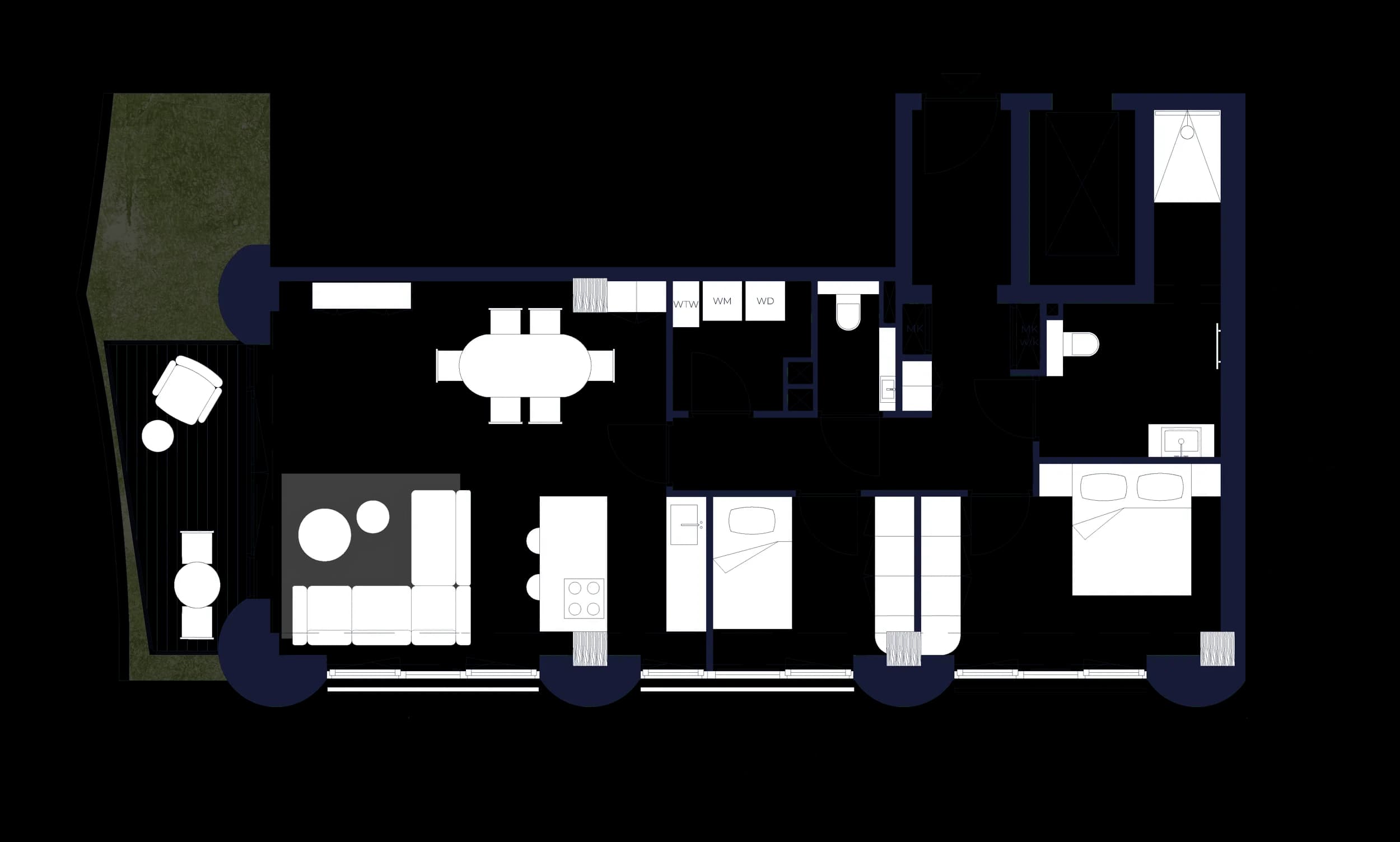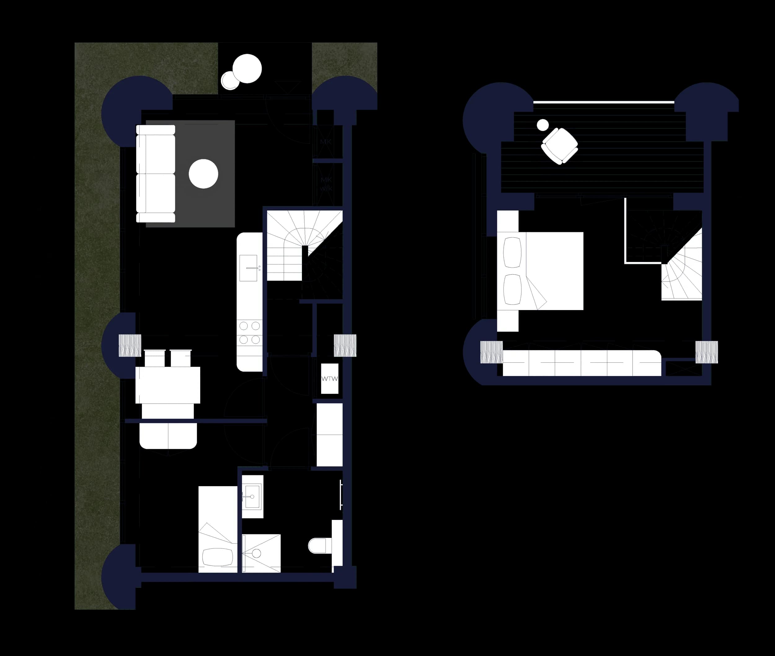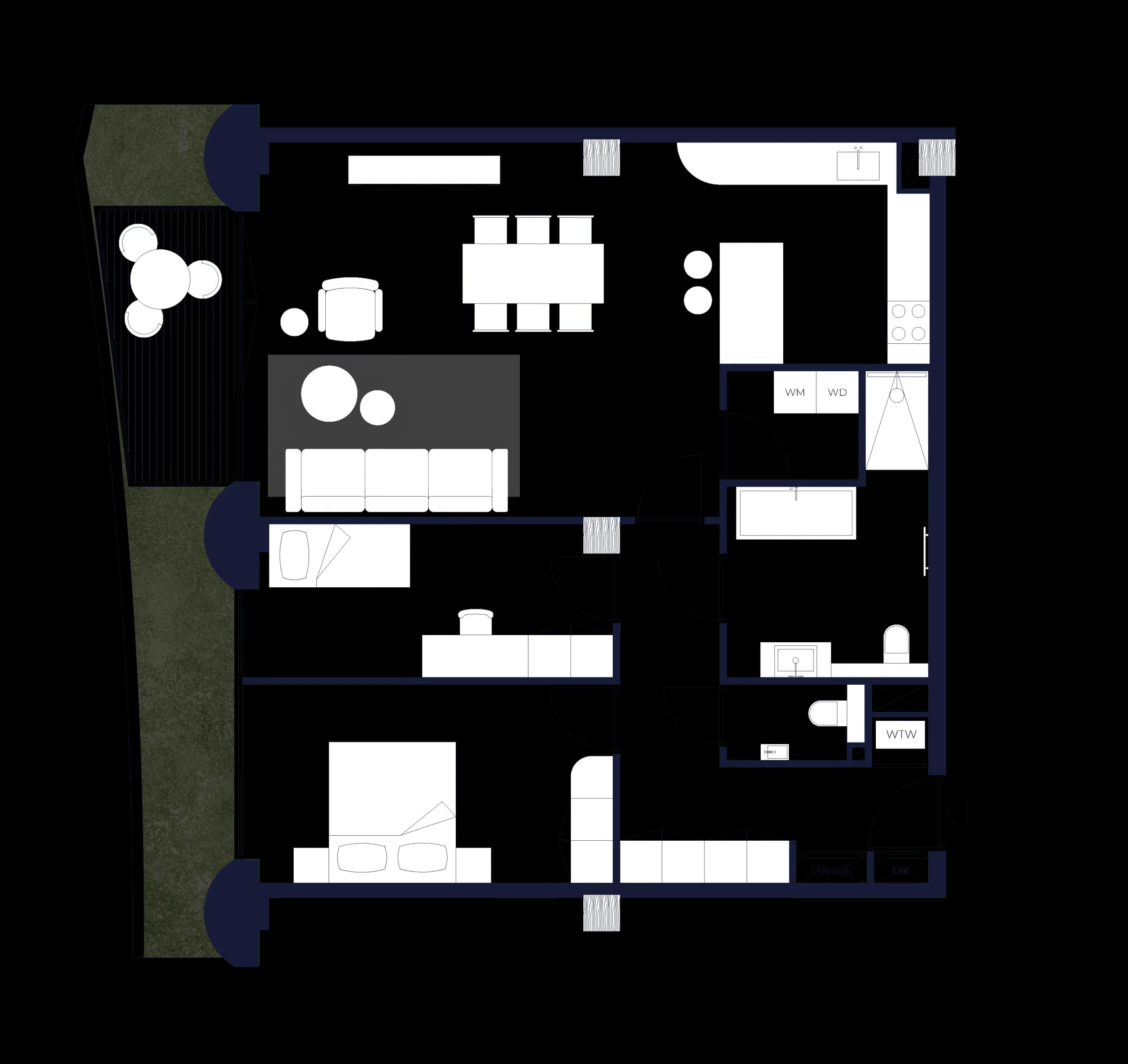 The generous 2‑bedroom, 2‑bathroom apartments are larger in size (100sqm) and oriented to the west, with views over the future canal that will be created here. Eight in total, they offer spacious single‑level living and long evening light.