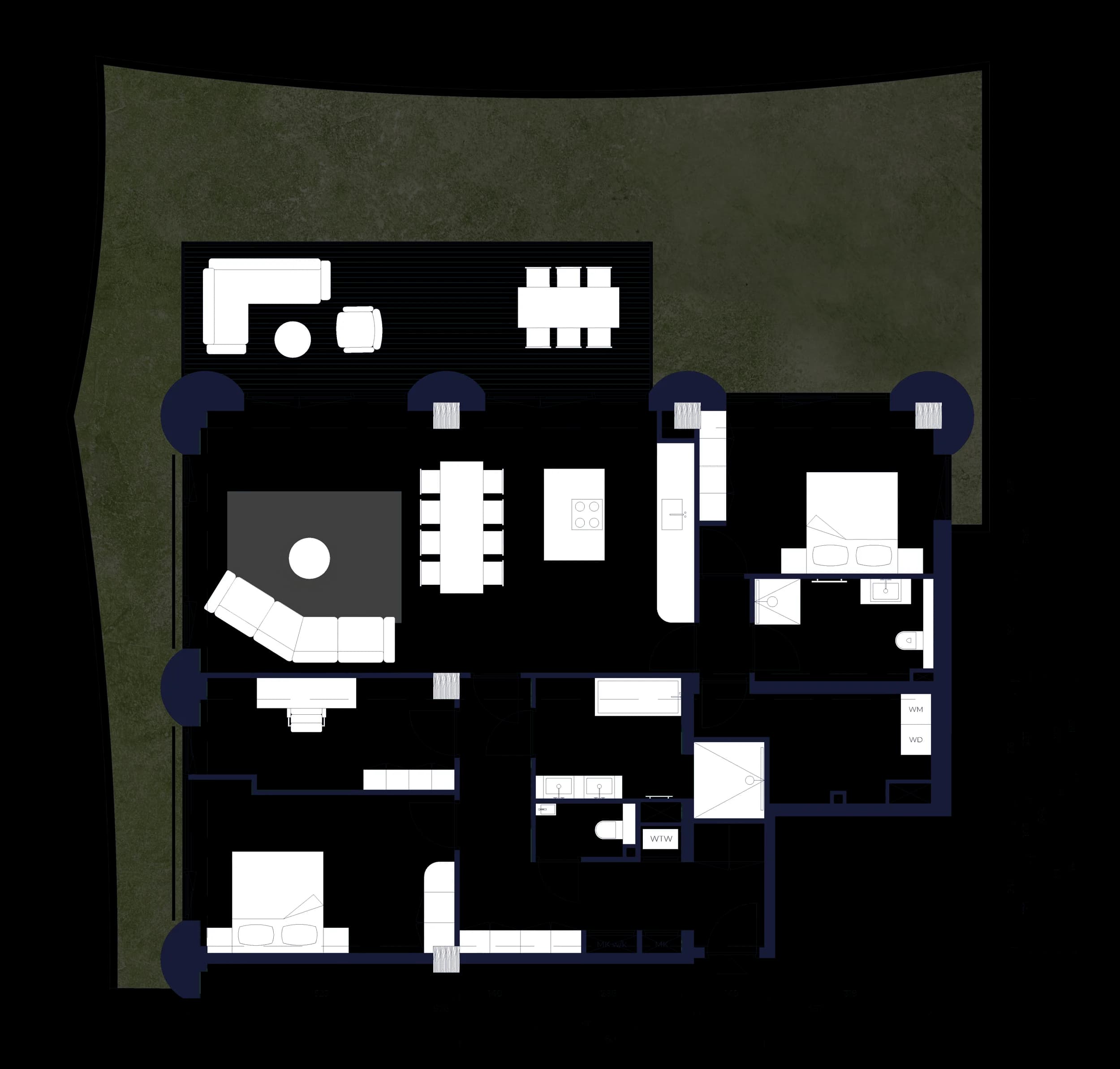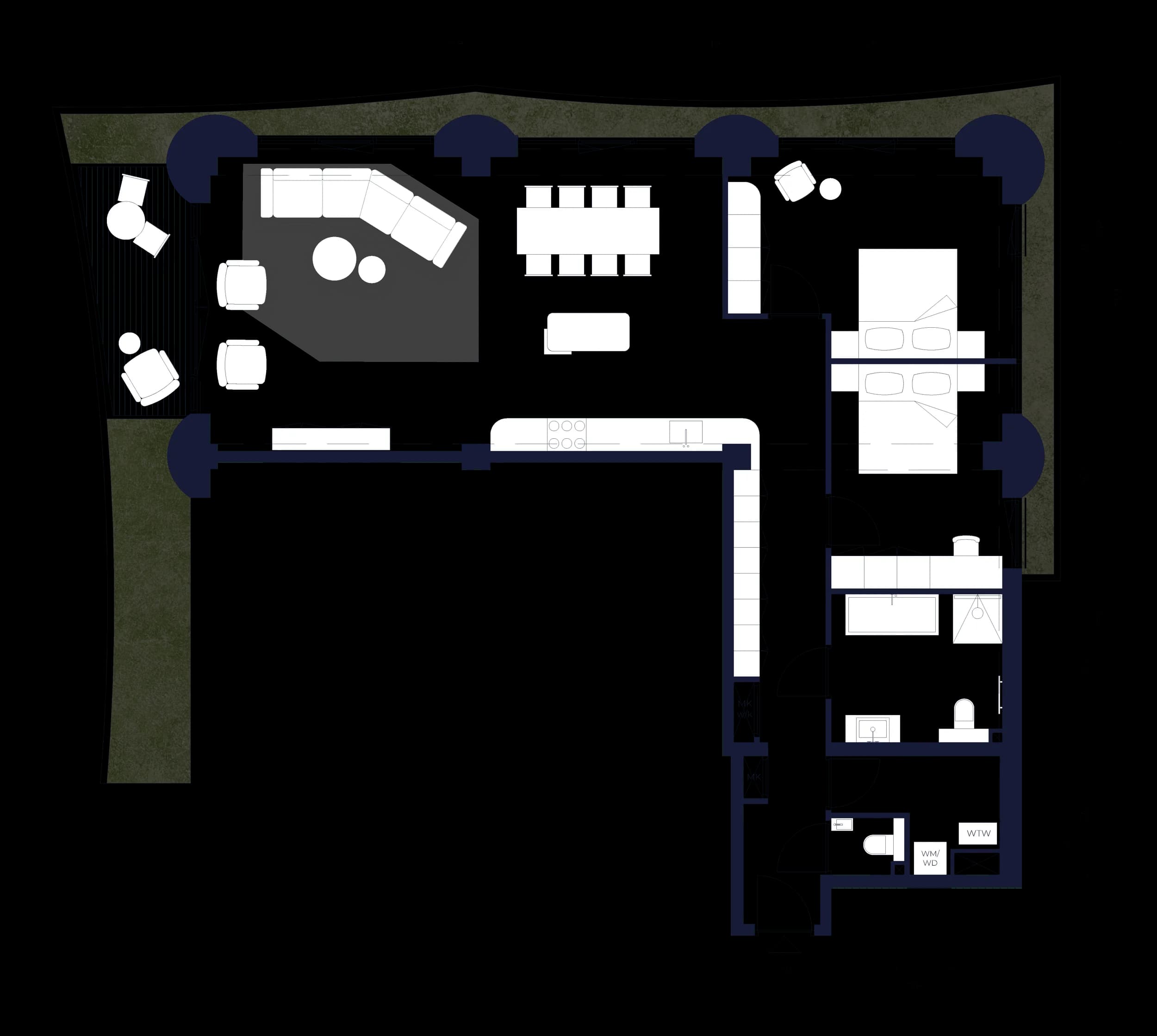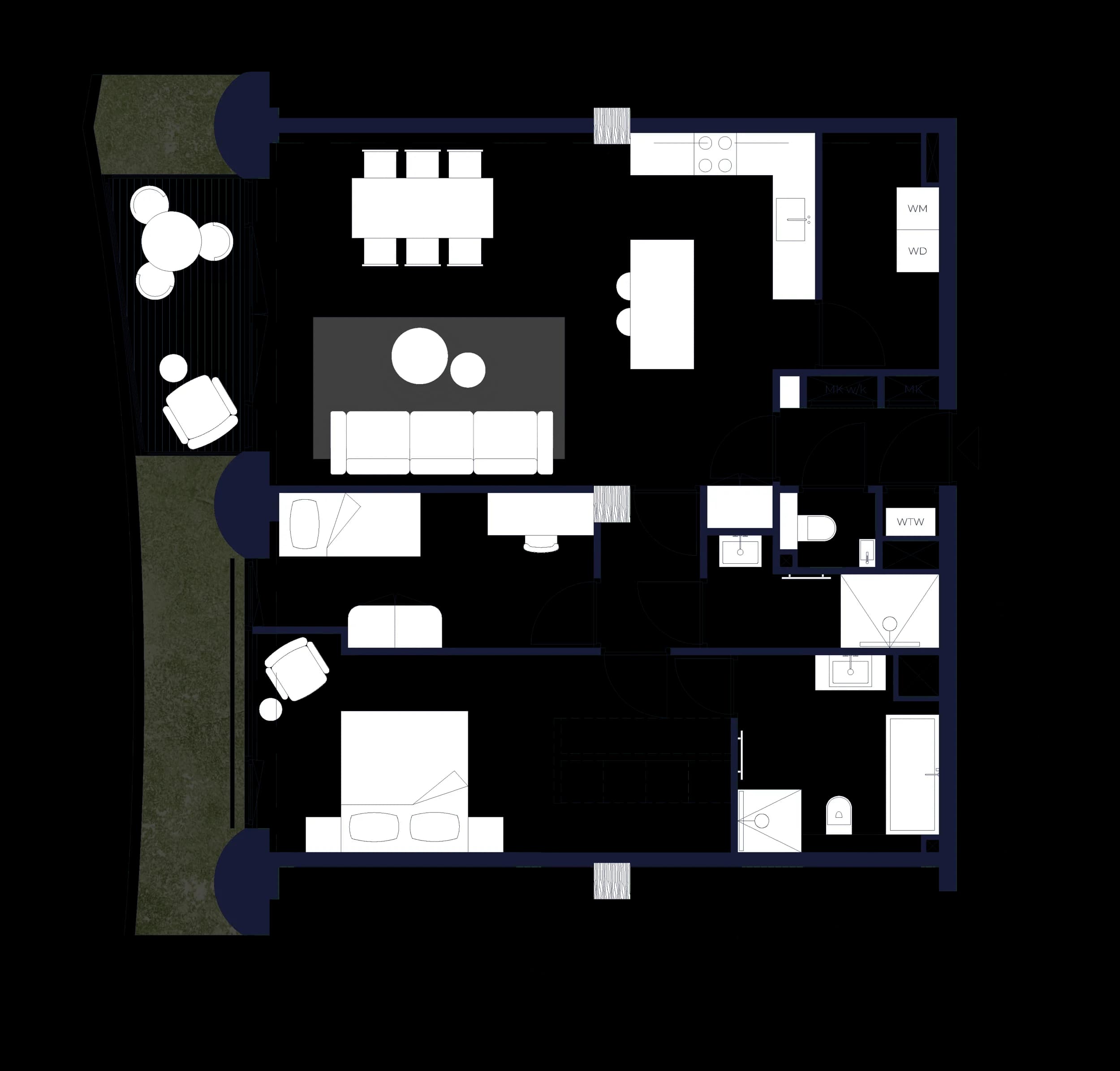 Ground-floor two-bedroom entresol residence, centrally positioned as the middle of three signature homes, with its own private entrance and 9 sqm of secluded outdoor space. Oriented to the north and west and opening onto the intimate inner courtyard, where privacy meets Ceci’s lush green heart.